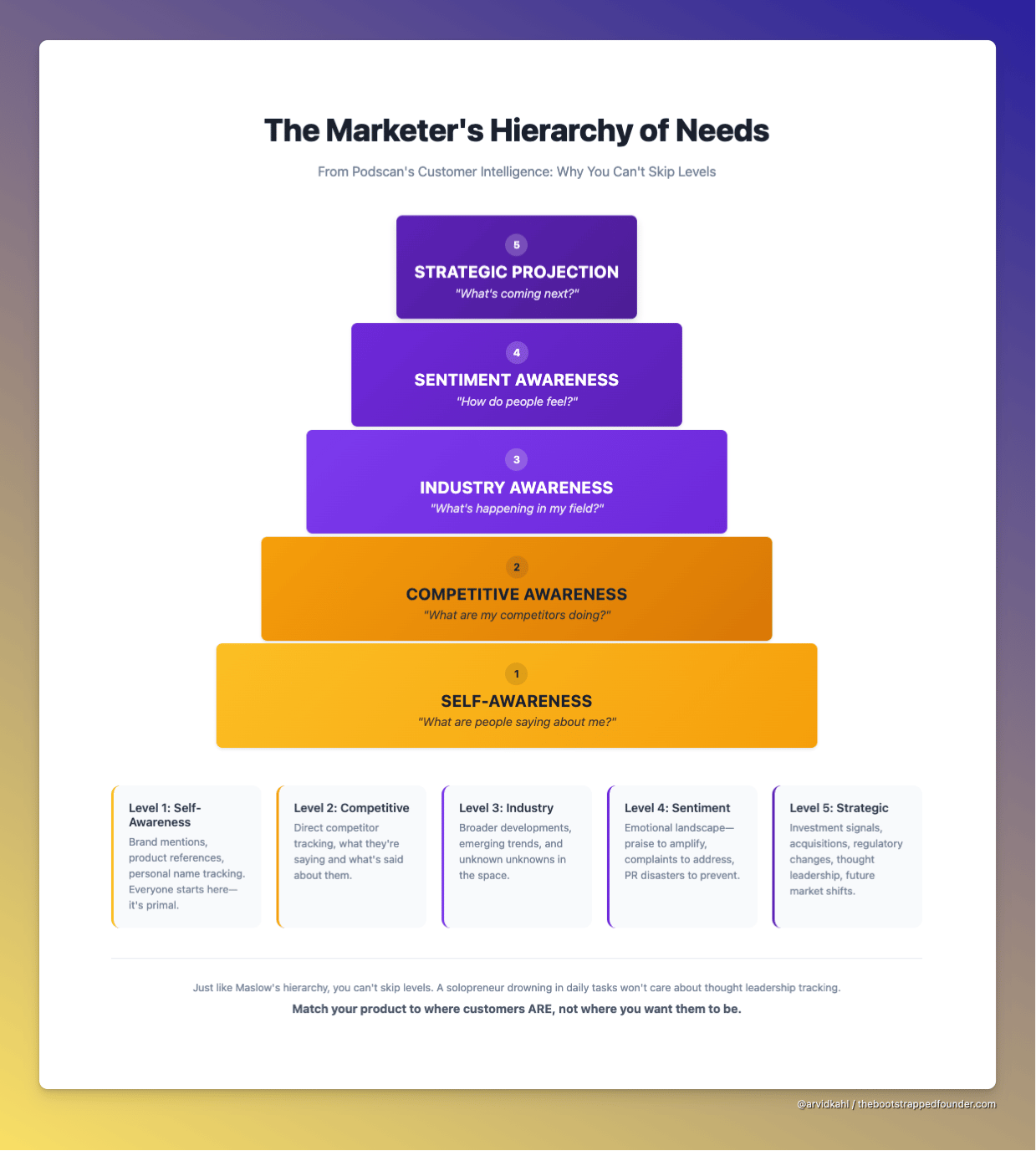 Podcast, YouTube, Blog Dear founder, One of Podscan’s main customer profiles that I’ve recognized over the last couple years building this business is marketers - people who think in marketing terms, who have marketing jobs and marketing goals. And in a way, even my other customer profiles - founders, builders, public relations experts, researchers - all of them have a similar process to how they use the data that Podscan provides, whether it’s the alerting system or the deep full-text search...